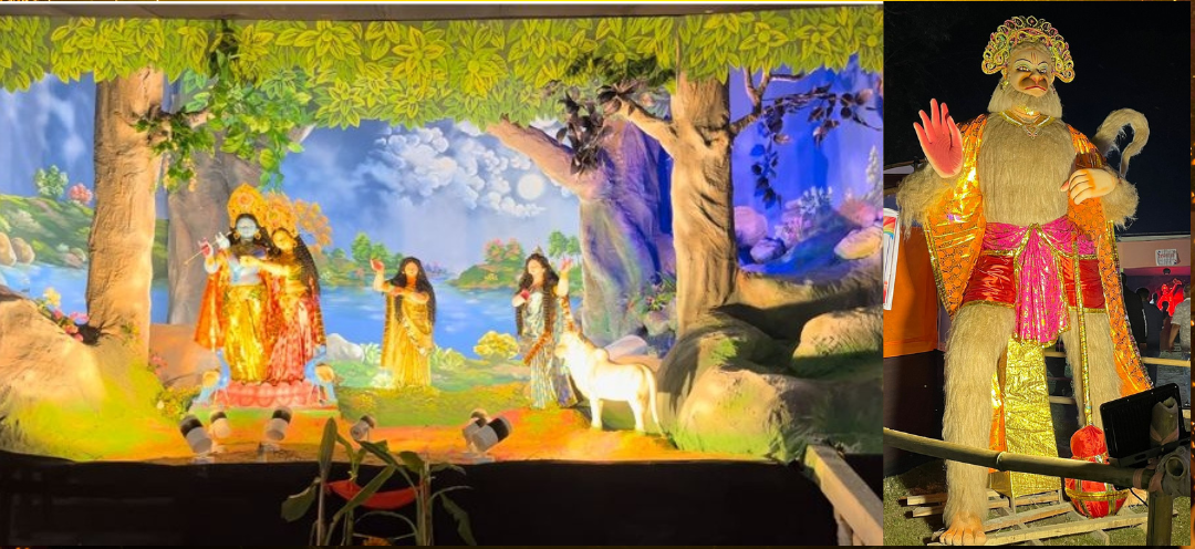 One of the main attractions this year is the magnificent clay idol of Lord Hanuman near the main gate, along with a striking depiction of Lord Shiva installed in the middle of the Kaldiya River. Ancient human life and activities, along with exquisitely crafted idols depicting scenes from the Vedas, Mahabharata, and Ramayana, has added a creative and educational dimension to the celebration.